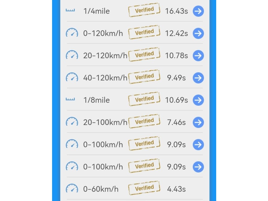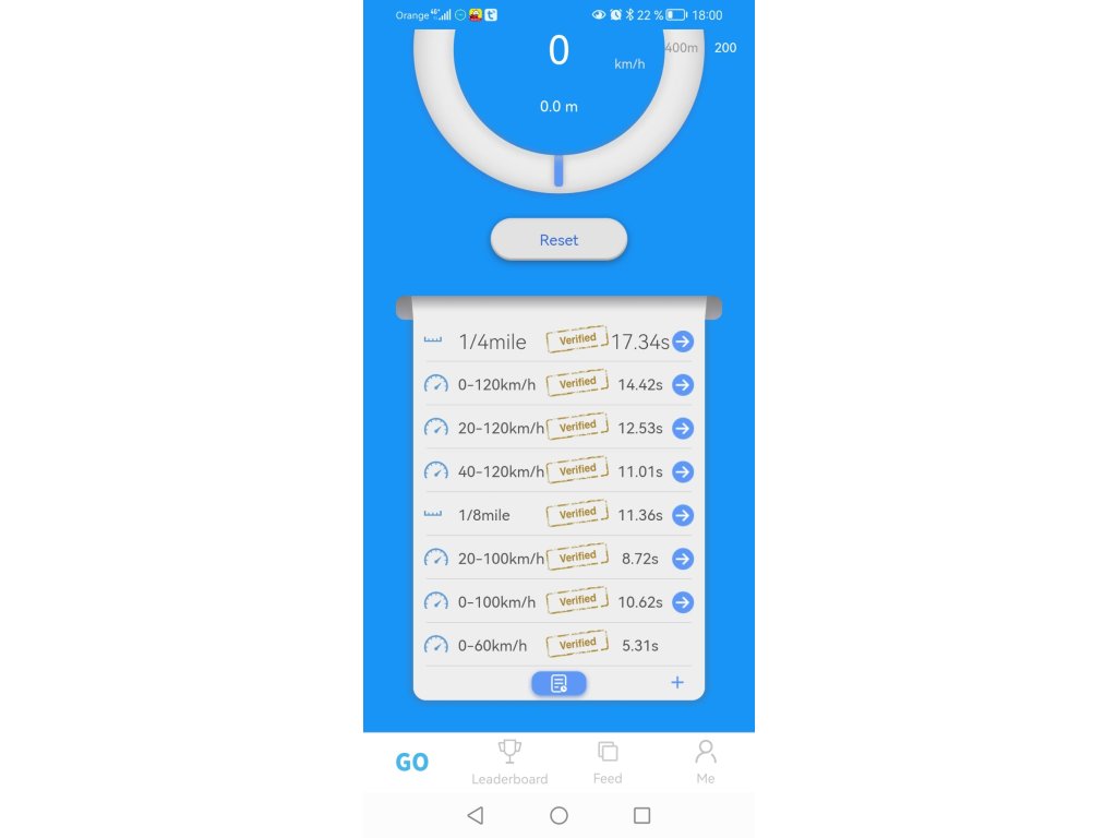 - Meranie času zrýchlenia, napríklad 0–60 km/h, 0–100 km/h, 100–200 km/h (možnosť nastaviť si akýkoľvek rozsah)