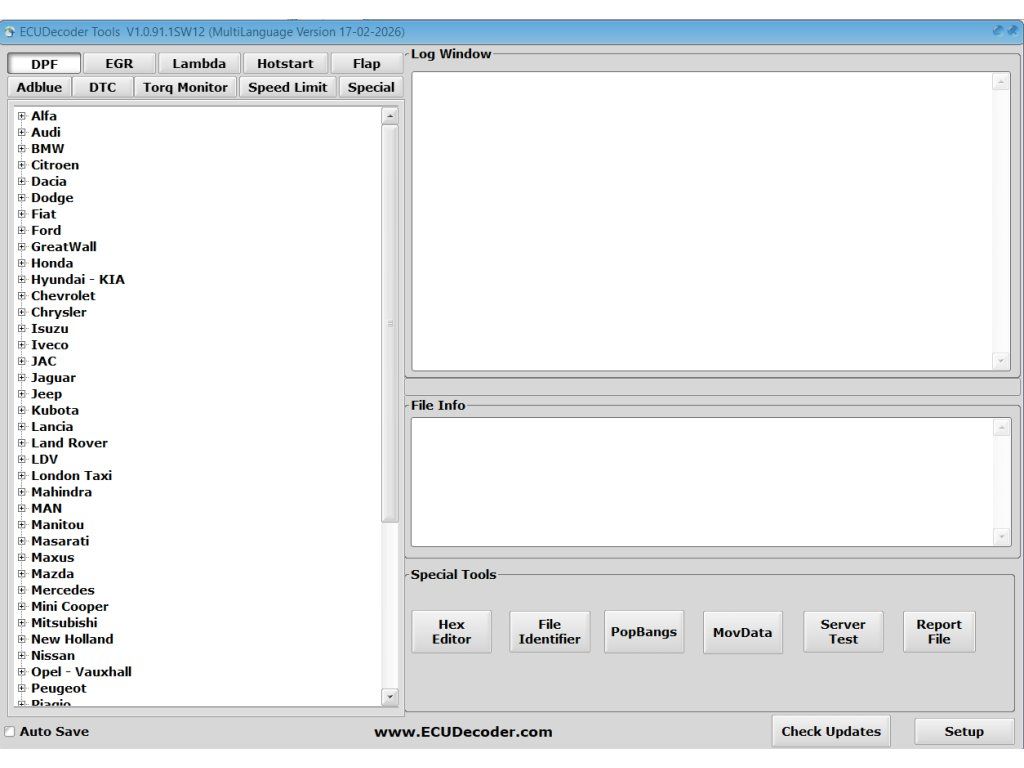 ECUDecoder Tools (starý názov bol Professional EGR+DPF+Lambda Remover) - program na vypínanie komponentov v softvéri a rôzne ďalšie funkcie (EGR, DPF, Lambda, chybové kódy, AdBlue, MAF, NOx, O2, TPROT remove, klapky, Start-stop, teplé štarty, limitér rýchlosti, IMMO OFF...).