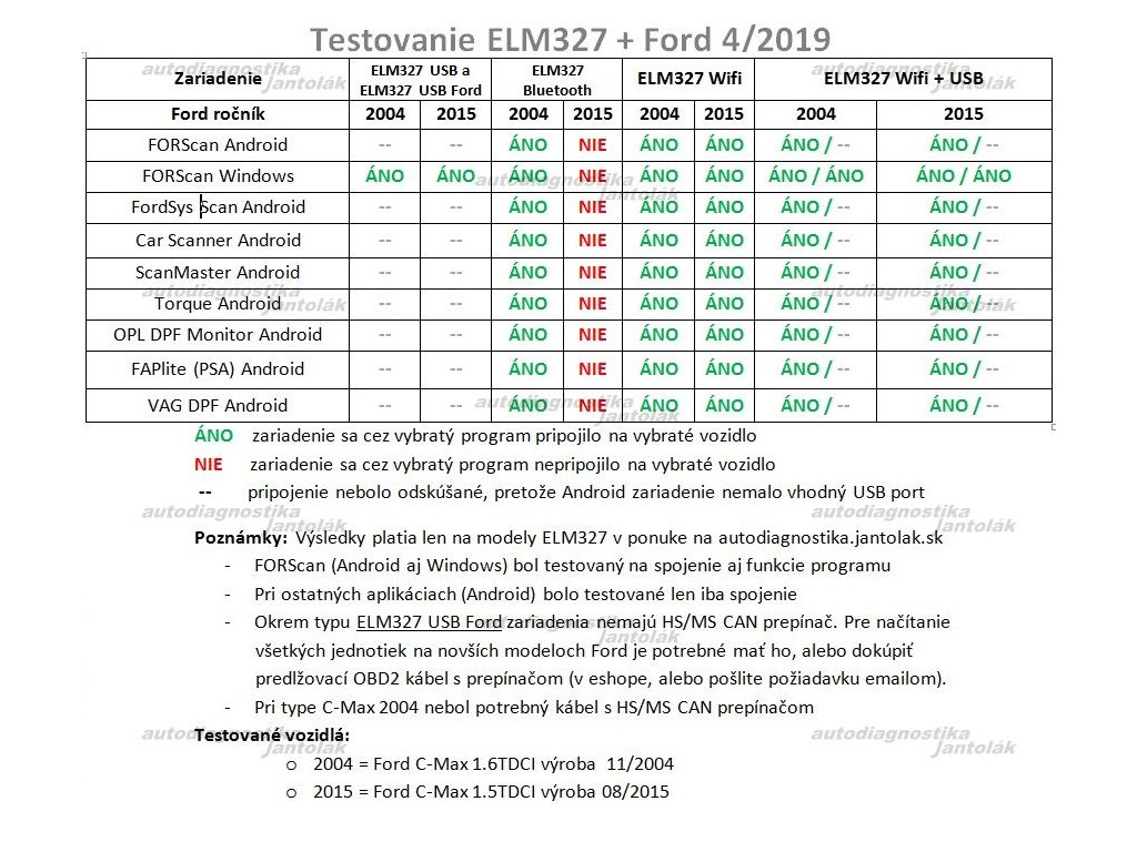 - Ford - otestované s Android aplikáciou ForSys (s MS-CAN adaptérom / s prepínačom) na vozidle Ford Mondeo 2017, pri USB verzii s aplikáciou FORScan