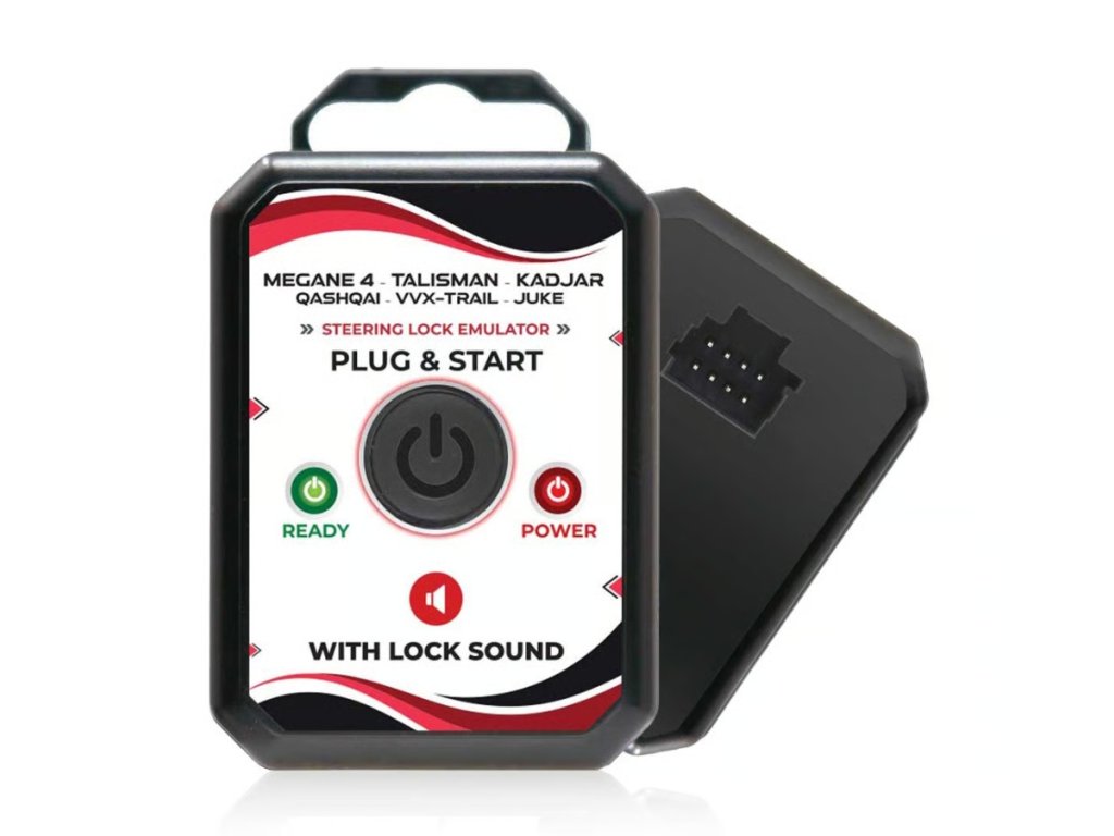 - 7. RENAULT+NISSAN s konektorom - tento emulátor podporuje vozidlá Renault Talisman, Megane 4, Kadjar a Nissan X-Trail, Qashqai, Juke a Micra. Inštalácia Plug and Start = jednoducho zacvaknete do emulátora konektor a bez akéhokoľvek spájkovania / programovania máte chybný zámok volantu nahradený (video ukážka). Tento typ generuje aj zvuk odomknutia.