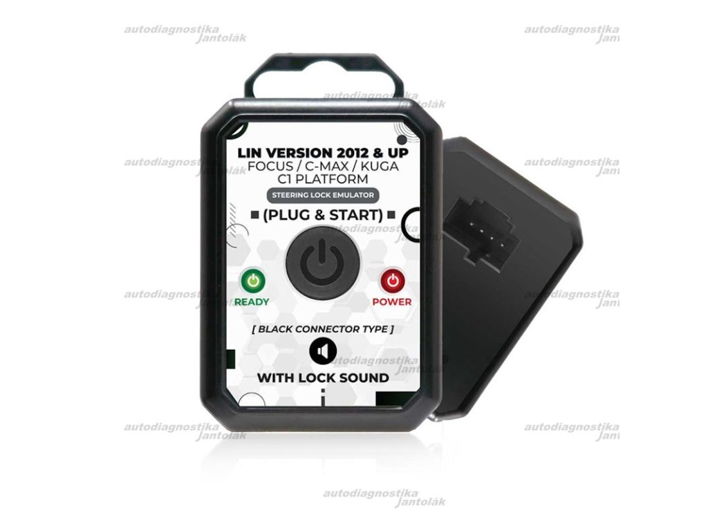 - 19. FORD TYP1 - Focus (MK3), C-MAX, Kuga (MK2), novšie generácie približne 2012+, 4 pinový konektor čiernej farby na zámku (nie zelený, pre ten je určený emulátor TYP3). Inštalácia Plug and Start = jednoducho zacvaknete do emulátora konektor a bez akéhokoľvek spájkovania / programovania máte chybný zámok volantu nahradený. Tento typ generuje aj zvuk odomknutia. Emulátor nie je určený pre Kuga 1. generácie, ani Focus 2./2.5 generácie.