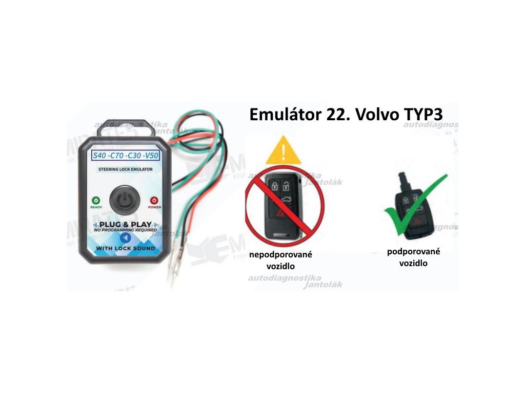 - 22. VOLVO TYP3 - S40, C70, C30, V50, len bez systému Smart Remote (musíte mať kľúč s plastovým výstupkom) - pozrite fotky. Emulátor obsahuje automatické programovanie - podľa návodu a videa ho pripojíte najprv do OBD2 konektora + na pôvodný zámok volantu (musí mať funkčnú elektroniku, nevadí ak je zaseknutý) a po dokončení ho zapojíte priamo na konektor namiesto vadného zámku. Vodiče na programovanie sú súčasťou balenia. Tento typ generuje aj zvuk odomknutia.