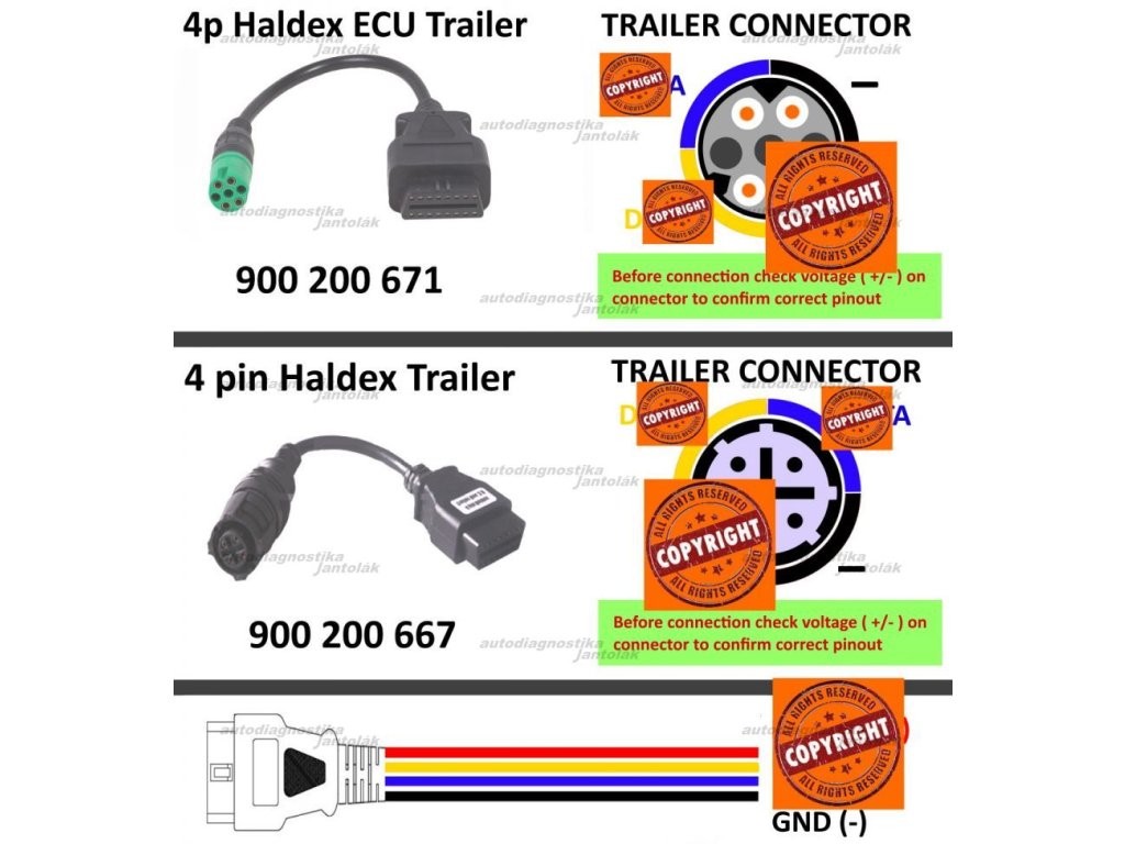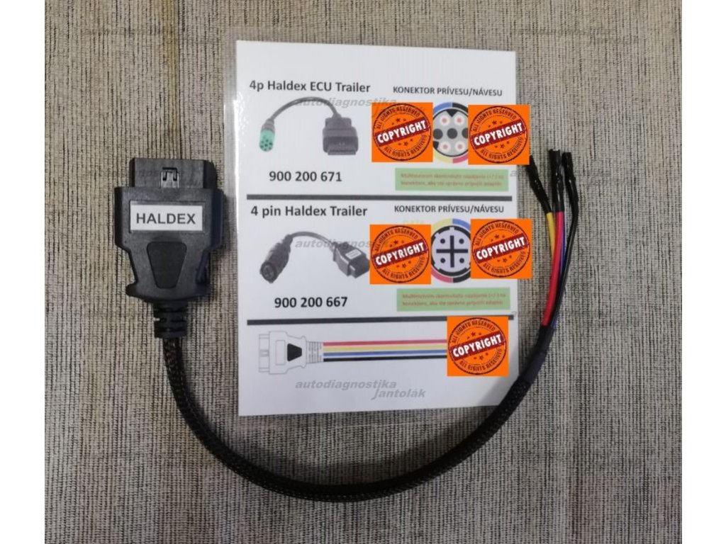 Napinovacia dovojredukcia pre prívesy / návesy so systémom Haldex a 4 / 7 pinovou (vždy zapojené po 4 piny) diagnostickou zásuvkou na bočnej strane, alebo priamo na riadiacej jednotke (medzi nápravami). 100%-ná funkčnosť, zapojenie vypracované podľa originálnych kusov, odkontrolované testovaním na návesoch. Pripojenie sa robí jednoducho formou napinovania (balenie obsahuje nový farebný návod s obrázkami oboch typov konektorov). Redukcia je určená len pre zariadenia Autocom / Delphi / Wurth a nahrádza adaptéry s objednávacími číslami 900200671 + 900200667.
