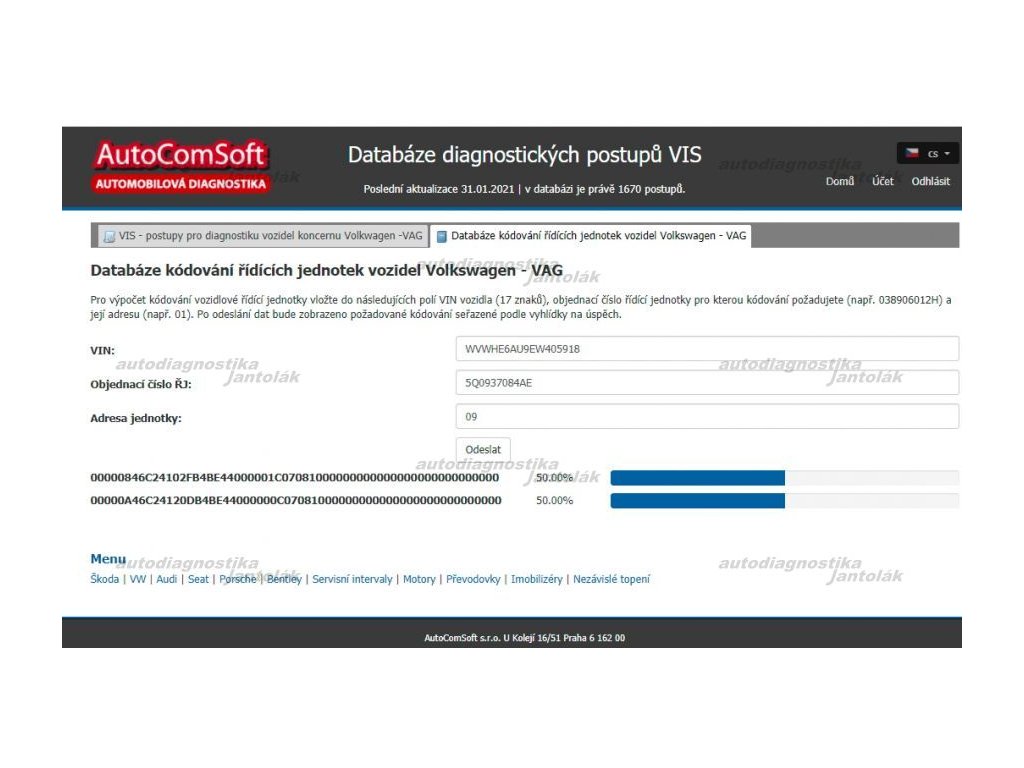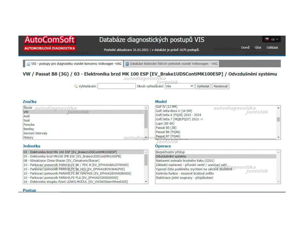 Informačný program VIS Online: Keďže nie je možné, aby si človek zapamätal nastavovacie postupy pre také situácie, ako je napríklad výmena riadiacej jednotky motora, zmena kódovania, základne nastavenie škrtiacej klapky, prispôsobenie kľúčov, regenerácia DPF... je tu program Vag Info System (VIS). V najnovšej verzii ponúka množstvo diagnostických postupov od najstarších áut ako Felícia, Polo 96+, Golf 3, Octavia I... až po najnovšie ako Fabia 4, Octavia 4, Superb 3, Kodiaq, Karoq, Kamiq, Citigo, Passat B8, Golf VII, T-Roc, Touareg CR, Tarraco, Teramont, Audi A4/A5/A6/A8/Q7/TT, Alhambra, Ateca, Arona, Altea, Leon, Toledo, Mii a ďalšie. Pre množstvo modelov má postupy aj samotný program VCDS. Program VIS Online je kompletne v češtine, vyvíjaný firmou AutoComSoft a od roku 2018 je aktualizovaný už len v online verzii - prihlásite sa na portál a všetky návody máte dostupné, nemusíte nič inštalovať. Zároveň môžete využiť funkciu zistenia továrenského kódovania riadiacej jednotky podľa VIN (táto funkcia je aj v programe VCDS pod tlačidlom On-line služby).
